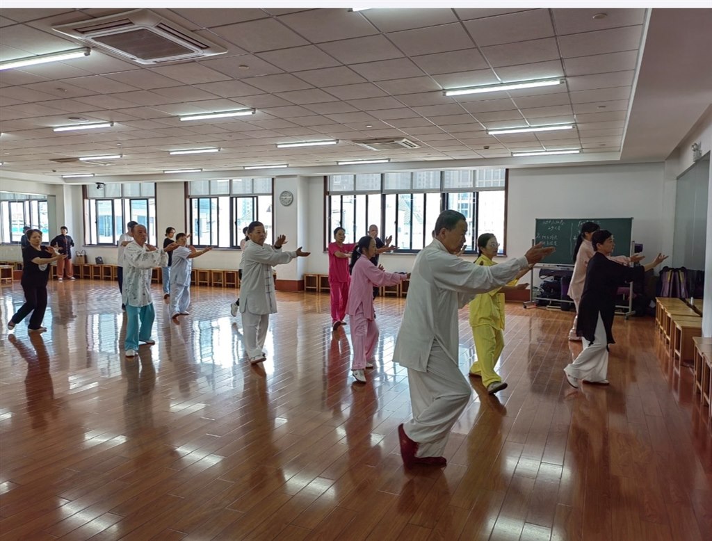 我们班年纪最大的薛同学,杜老师会专门走到他跟前帮着调整姿势,并放慢速度示范着“起势”抬手和下按的动作。对“揽雀尾”老师还会轻轻辅助他转动身体,确保着每个动作的到位。我们的班委王同学膝盖之前有点扭伤,但他被老师的教学态度和同学们的学习劲头所感染,不但坚持来上课且都会提前近1个小时来到课堂,一边请教杜老师,一边自己对着镜子反复演练。