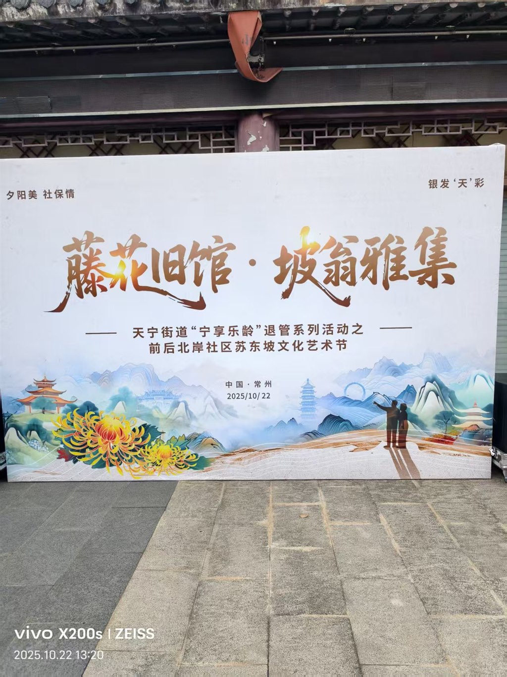 金桂送香,菊花灿烂。10月22日(周三)下午,【藤花旧馆·坡翁雅集”天宁街道“宁享乐龄”退管系列活动之前后北岸社区苏东坡文化艺术节在常州历史文化名街---前后北岸大石牌坊小广场正式开始了。