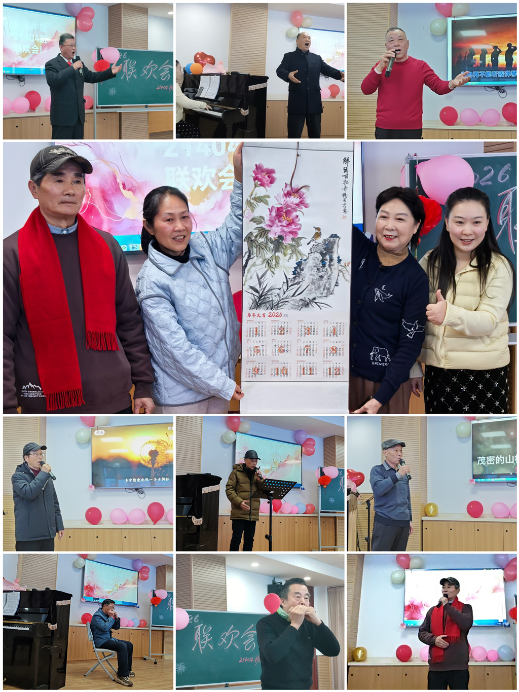 9点整,种丽华班长作为班级期末联欢会的主持人,第一个走上台,为同学们表演诗朗诵:从明天起,做一个幸福的人……海子写的一首诗《面朝大海,春暖花开》正式拉开2026联欢会序幕。紧接着,在同学们的掌声中,女生邵雪芳唱起了《晚风中的红树林》;在徐晨钰老师的钢琴伴奏中,男生薛玮同学用浑厚的声音独唱了本学期教的《白云故乡》,再一次把我们带回到对故乡的深深思念,在近现代艺术歌曲中大家感受了旋律的优美、节奏感的强烈,很强的感染力和共鸣。接着,张美珍同学的英文独唱《雪绒花》、毕剑军的《最美的歌唱给妈妈》》、张耀脐的独唱歌曲《怀念战友》……不知不觉的6个节目表演后,来到了第一轮互动抽奖环节(这是本学期特意增加的环节),主持人特地邀请同学恽锡芳上台为同学们抽奖 。因为这次联欢会的奖品均是由恽锡芳同学通过自己这几年勤奋学习绘画课,特地绘制的2026年年历画:“水墨丹清、富贵花开”等5幅作品,本次联欢会将它们作为奖品赠送给一起歌唱的班级同学们。