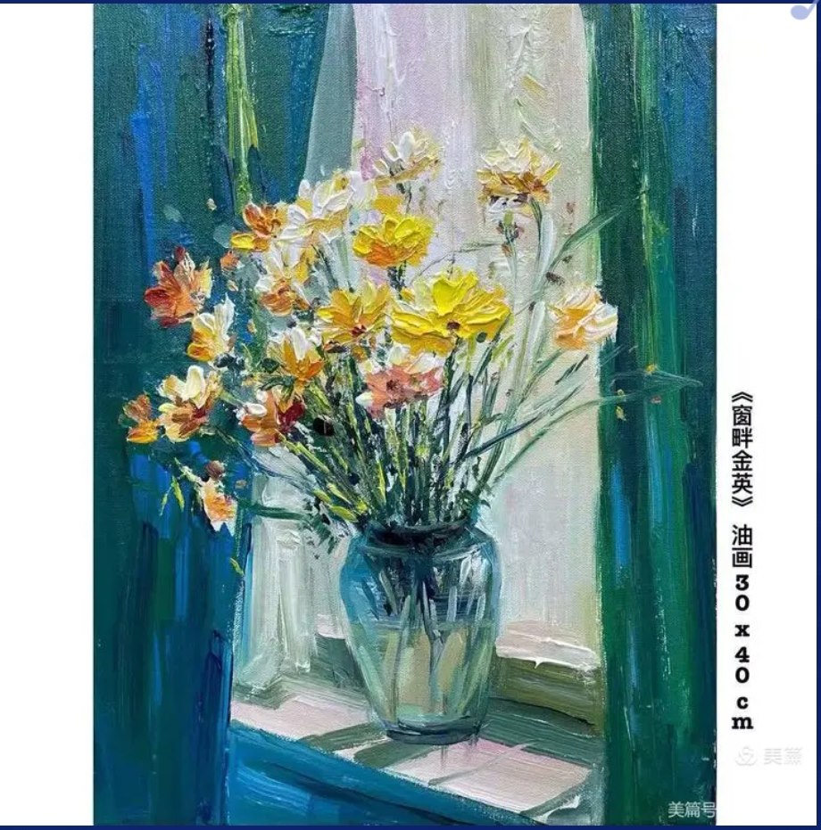 静心观望,缓缓成画,两幅示范佳作徐徐呈现眼前;赏心悦目。《炽艳繁花》以浓烈的红粉交织,笔触饱满炽热,如火焰般热烈奔放;《窗畔金英》则以暖黄与柔白晕染,在窗畔的光影里漾开清雅温润的诗意。教室里赞叹声声,满眼敬意。连窗外的风都似乎放慢了脚步,想凑近看看满室的芬芳。