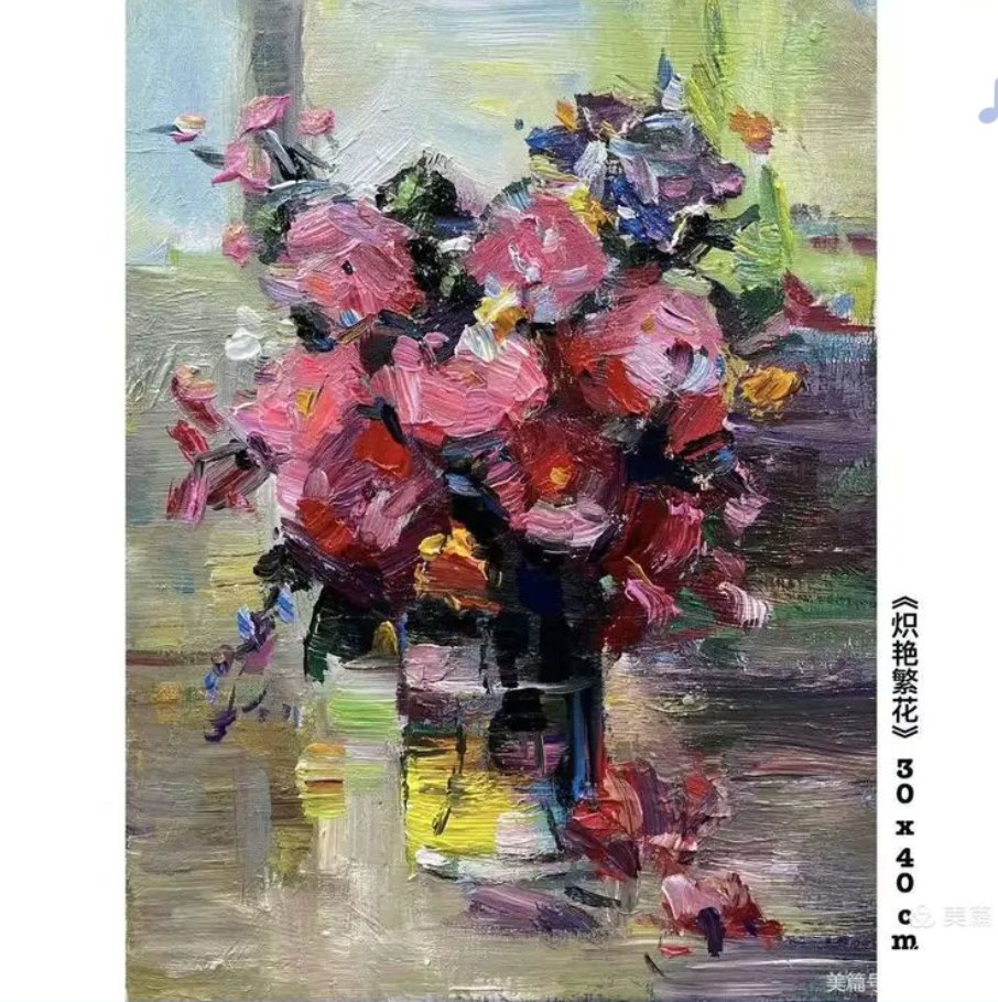 话音未落,他便拿起画笔,在画布上落下第一笔。粗犷的笔触间藏着细腻的色彩情思,浓淡相宜。层次灵动,仿佛能听见色彩在画布上轻轻低语。鲜妍花卉肆意绽放,正是人间生活本该有的明媚绚烂。