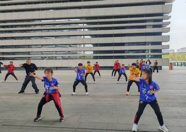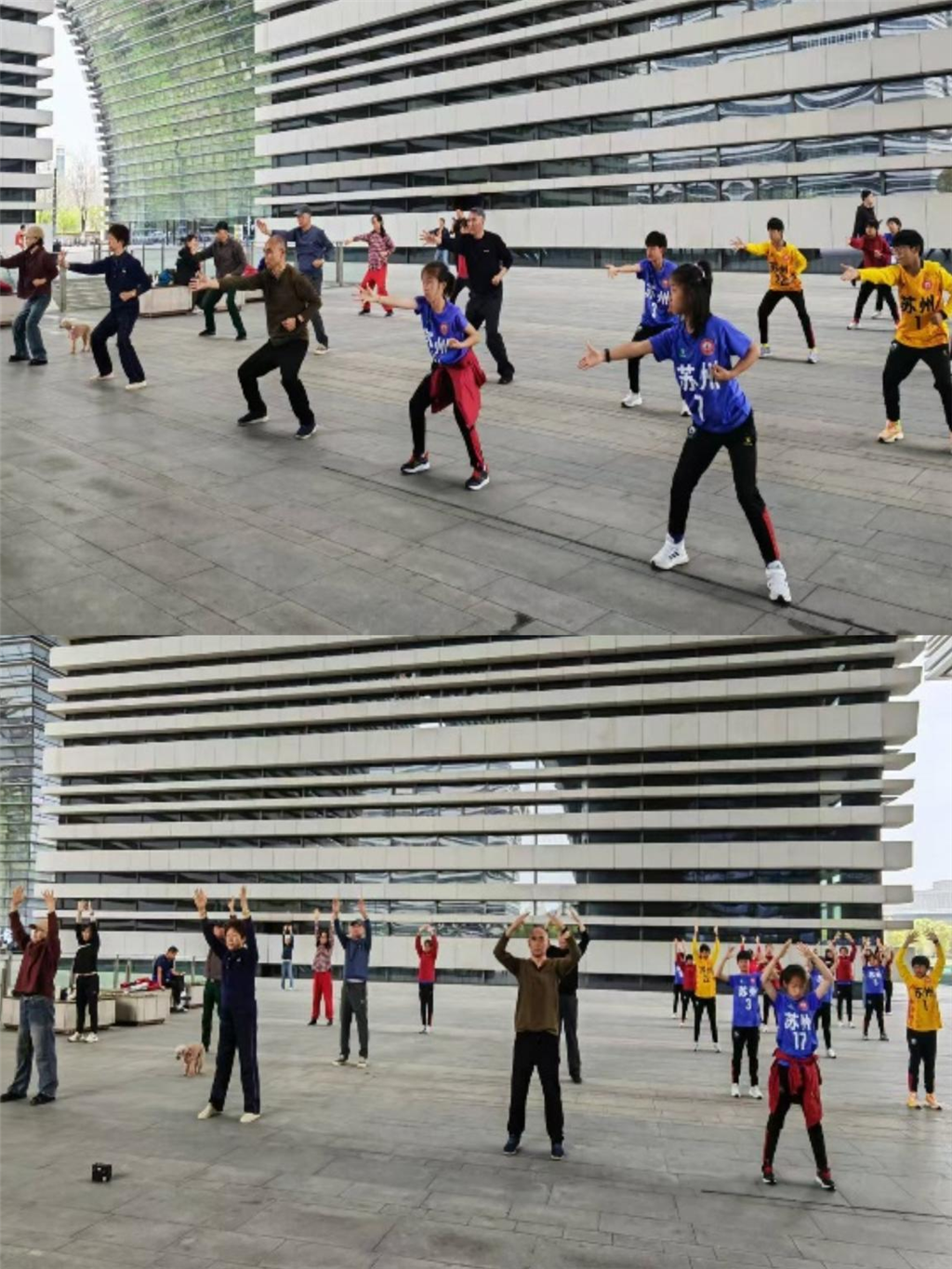 不知不觉间,队伍里忽然多了几道稚嫩的身影,正跟着一招一式认真比画。当健身气功・八段锦的音乐响起,又有一批小队员加入进来 —— 她们身着印有 “苏州” 字样的运动服,有模有样地跟着我们练习 “两手托天理三焦”“左右开弓似射雕”“调理脾胃须单举”…… 八段锦的每一个动作,她们都练得舒缓从容、刚柔相济。