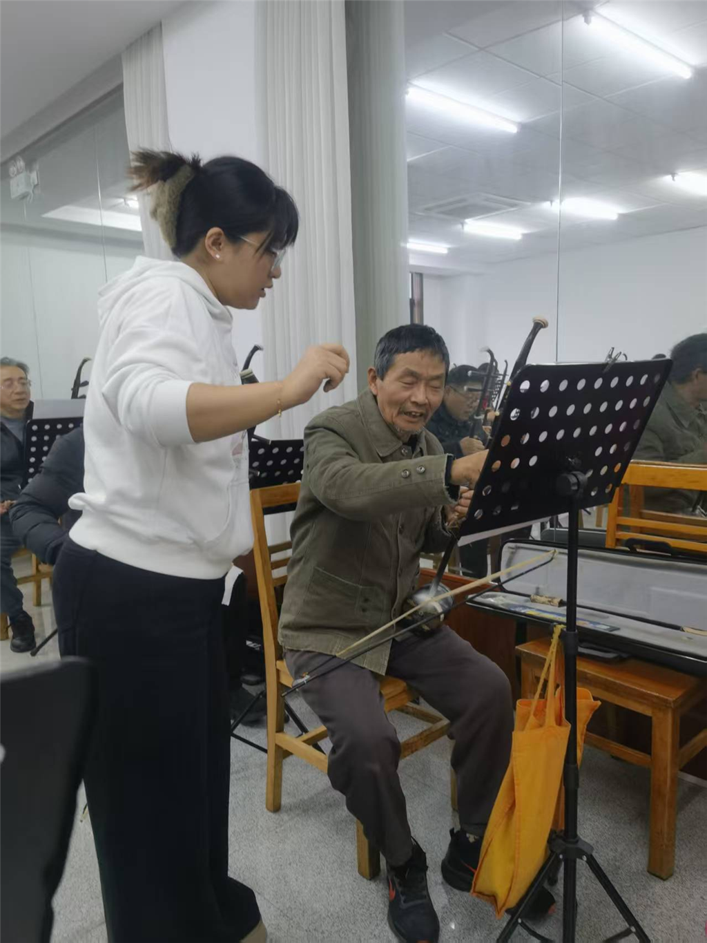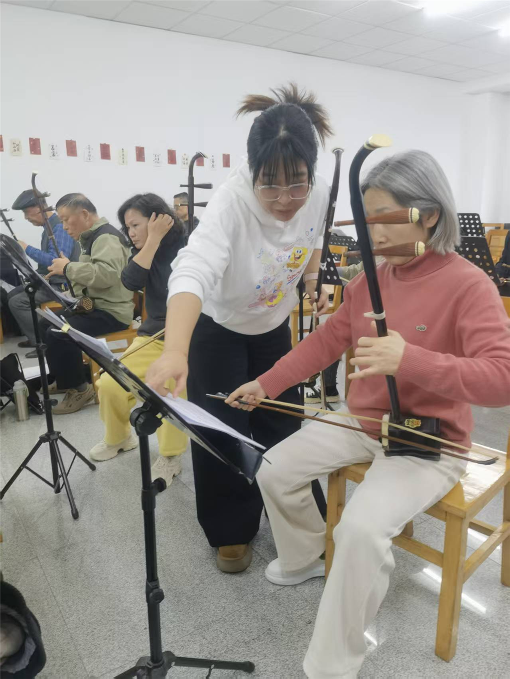 我们的范舒之老师,年轻而资深,耐心细致手把手地逐个教学,从基本功的练习,歌曲的演奏,到指导集体节目的展示,从调弦,换弦到换千斤……鼓励带动着慢跑的老人!老师的悉心教导让大家进步显著,攀登前行!