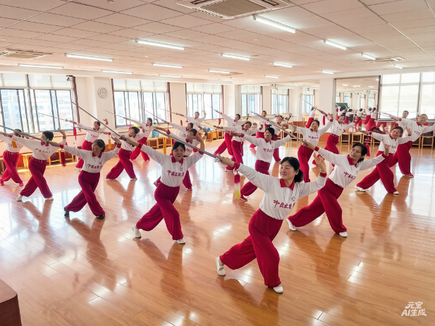 练习木兰剑,更是一种精神寄托。这是一项既能强身健体,又能陶冶情操、丰富社交的有益运动。练习过程中,大家不仅锻炼了身体协调性与柔韧性,更从花木兰征战的形象中汲取力量与自信,展现出新时代老人 “莫道桑榆晚,为霞尚满天” 的积极生活态度。