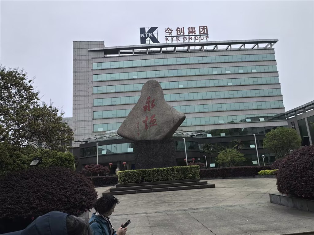 一走进今创集团大门,映入眼帘的便是整洁宽阔的厂区道路,迎面一座雄伟的办公大楼和郁郁葱葱的绿植。抓紧时间首先在办公大楼前合影留念。背后有一块巨大的观景石。上面刻着“永恒”二个鲜红的大字,象征着企业的永远和创业者的恒心。