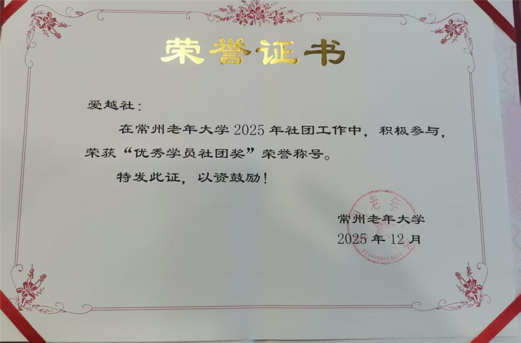 流年不负耕耘,岁月沉淀芳华。2025年硕果飘香,常州市老年大学声乐戏曲系《爱越社》不负时光,砥砺前行,凭借精彩的舞台演绎、浓厚的社团风气与积极的公益初心,成功荣获“优秀学员社团奖”及三百元奖金,这份荣誉凝结着全体社员的热爱汗水,更饱含着刘老师一整年的默默耕耘与悉心指引。