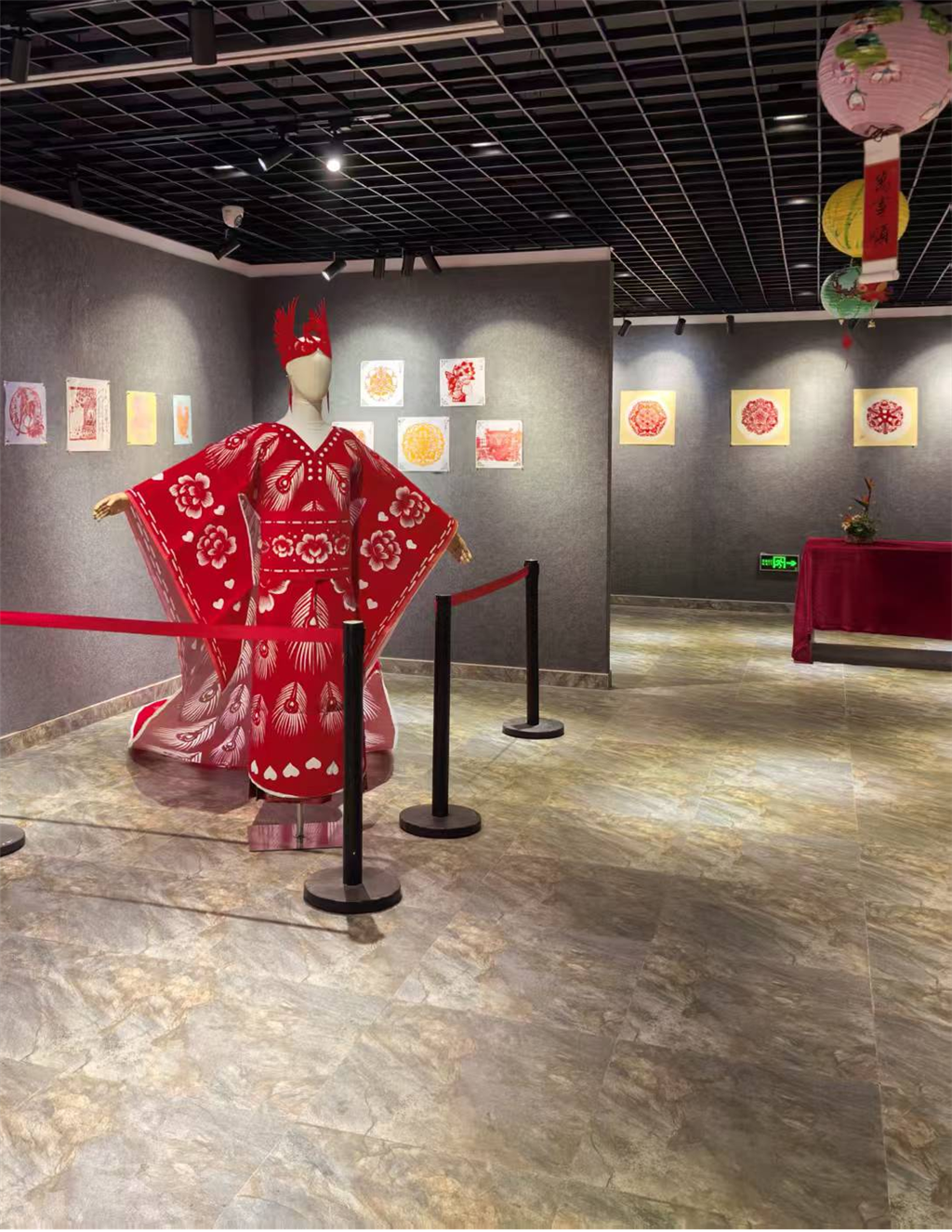 尤其是张蔚老师创作的大红凤袍,静静伫立在展区正中央,一针一线般的剪纸纹路细腻精巧,大红底色明艳庄重,尽显雍容华贵,一眼便成为全场焦点。张蔚老师的剪纸技艺早已炉火纯青,无论是花草树木、亭台楼阁,还是飞禽走兽,在她手中都能被刻画得精妙绝伦,让人由衷赞叹。她授课时很少借助模板,随手拿起一片剪纸碎片,便能脱稿创作,寥寥数剪,一幅别出心裁的作品便跃然纸上,每每引得我们全班同学拍手叫绝、赞不绝口。